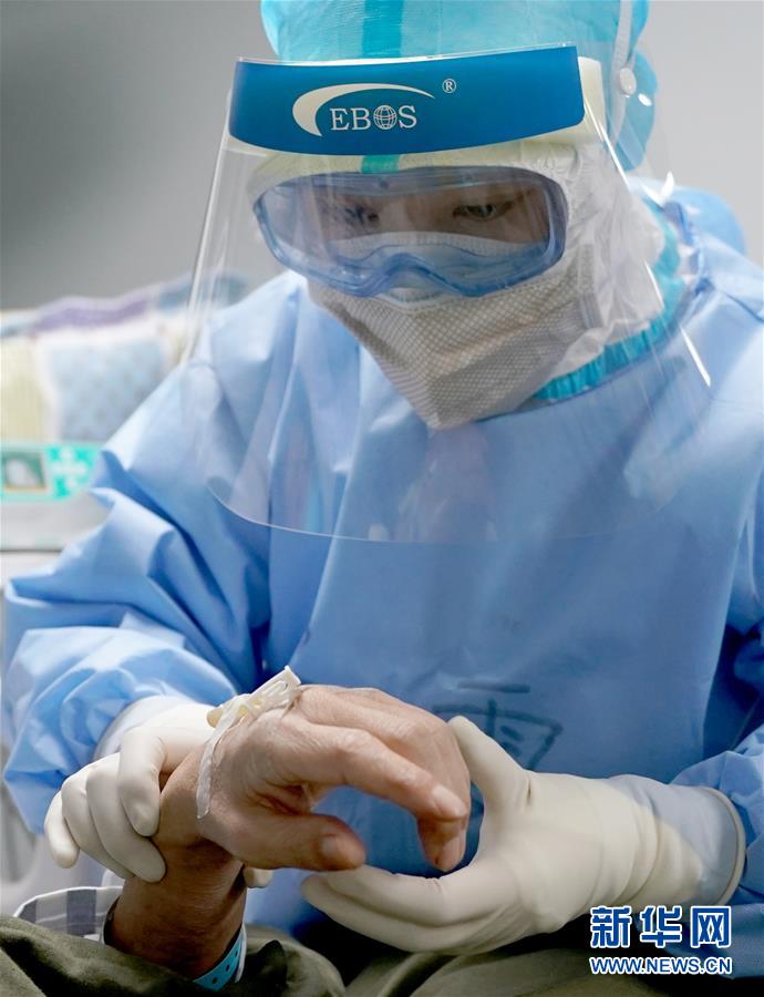 90后護士文雯在進行輸液前檢查留置針情況(3月20日攝)。 武漢火神山醫(yī)院重癥醫(yī)學一科的護理團隊共50名護士,其中絕大多數(shù)是80后、90后女性,她們不懼危險,奮戰(zhàn)在抗擊疫情的最前沿“紅區(qū)”。 新華社記者王毓國攝