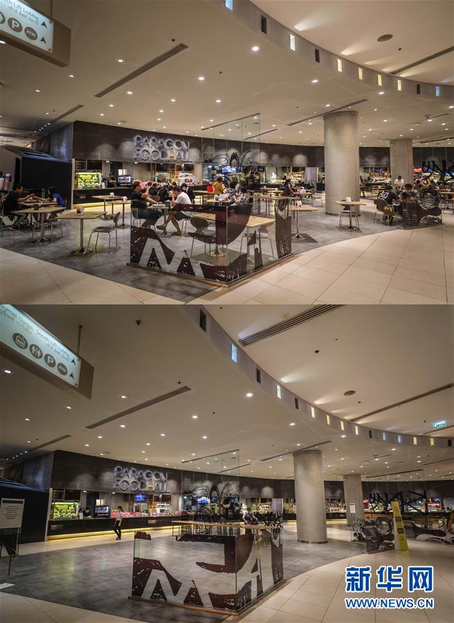 這是3月21日拍攝的泰國(guó)曼谷暹羅百麗宮商場(chǎng)負(fù)一層的美食城(上圖)和3月22日拍攝的美食城對(duì)比圖。商場(chǎng)除了負(fù)一層的美食城和超市外,全部關(guān)閉。美食城只對(duì)顧客提供外賣服務(wù)。新華社記者張可任攝