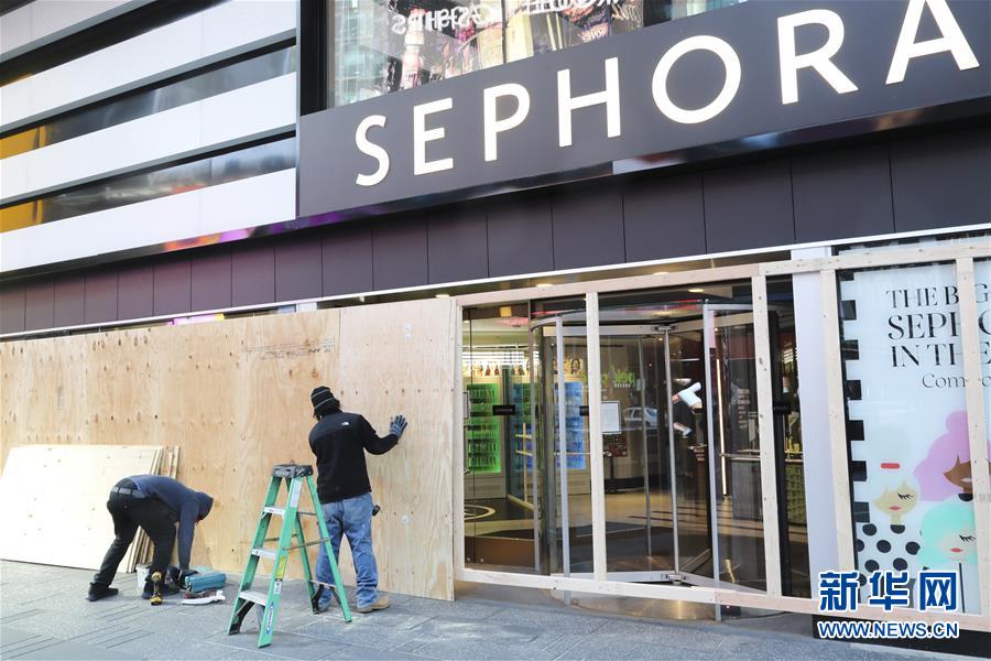 3月21日,在美國紐約時(shí)報(bào)廣場(chǎng),工人用木板封閉一家化妝品店。美國紐約州、伊利諾伊州、康涅狄格州20日發(fā)布針對(duì)本州居民的“居家令”,以遏制新冠病毒傳播。這些“居家令”涵蓋紐約、洛杉磯、芝加哥等大城市,影響數(shù)千萬人。白宮20日發(fā)表聲明說,總統(tǒng)特朗普已宣布紐約州出現(xiàn)“重大災(zāi)難”,命令聯(lián)邦政府支援該州抗擊新冠肺炎疫情。新華社記者王迎攝