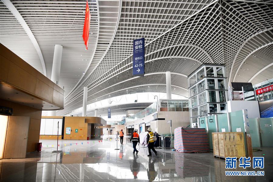 3月25日,兩名工人從建設(shè)中的青島膠東國(guó)際機(jī)場(chǎng)航站樓出發(fā)大廳走過(guò)。新華社記者李紫恒攝