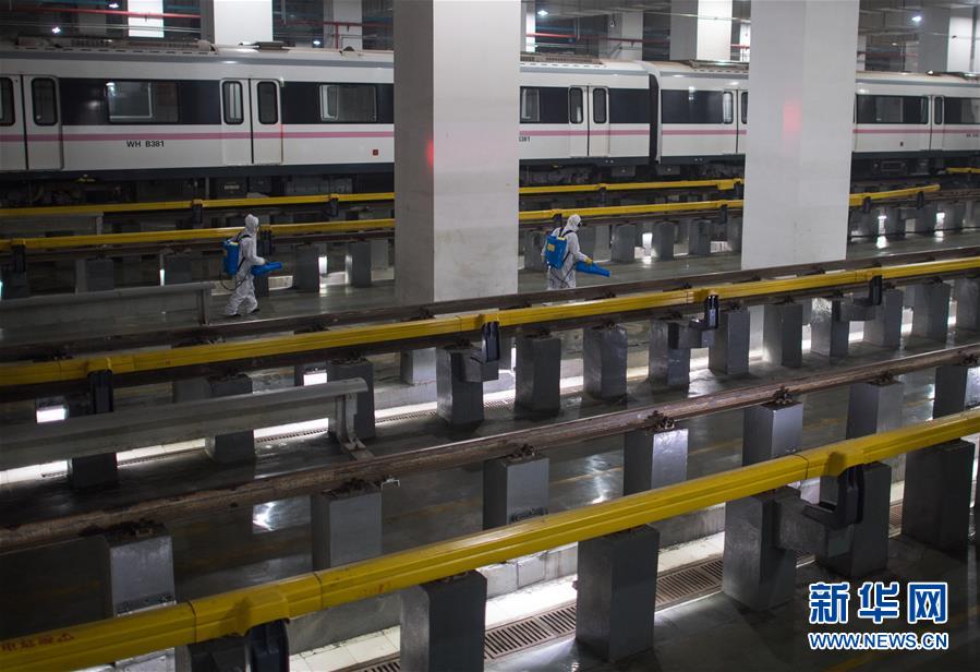 3月23日,在武漢地鐵常青車輛段,保潔人員在消毒。新華社記者肖藝九攝