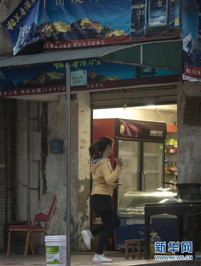 3月25日晚,武漢市民在街邊的便利店前跳健身操。新華社記者費(fèi)茂華攝