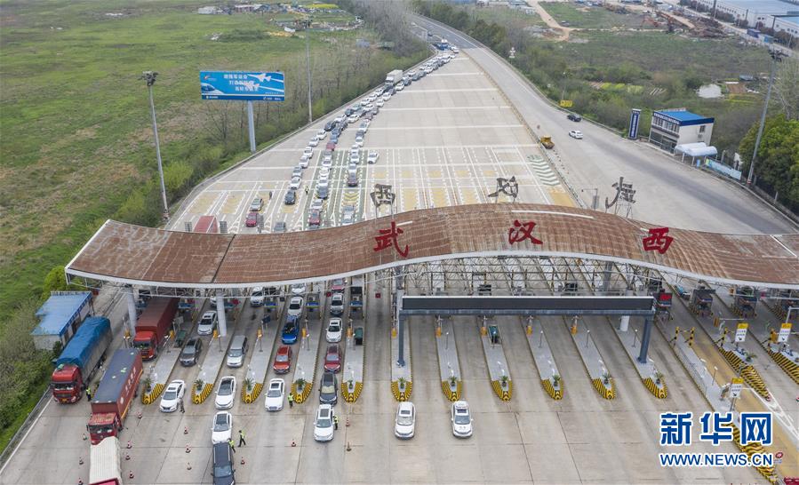 3月24日,在武漢西高速收費站交通卡點,返漢車輛排隊等候入城(無人機照片)。新華社記者才揚攝