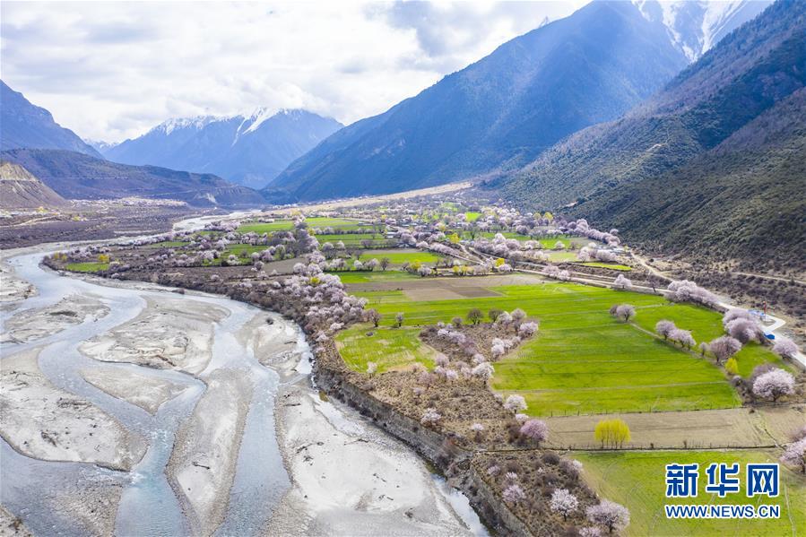 西藏林芝市波密縣境內(nèi)桃花盛開的田園風(fēng)光(無人機照片,3月26日攝)。新華社記者 普布扎西 攝