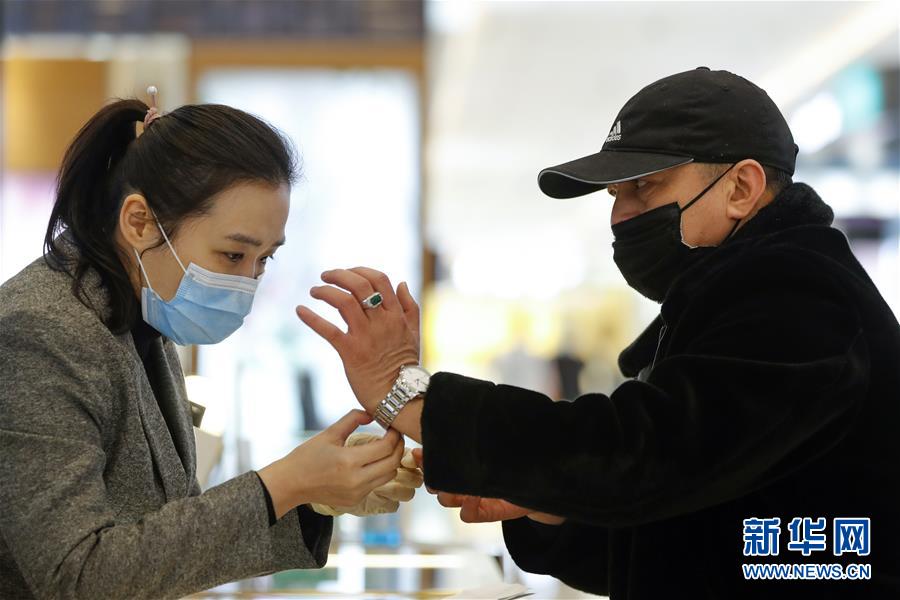 3月30日,在武漢市武商世貿(mào)廣場,一名顧客(左)在挑選手鐲。當日,武漢市多家商場開門迎客。新華社記者沈伯韓攝
