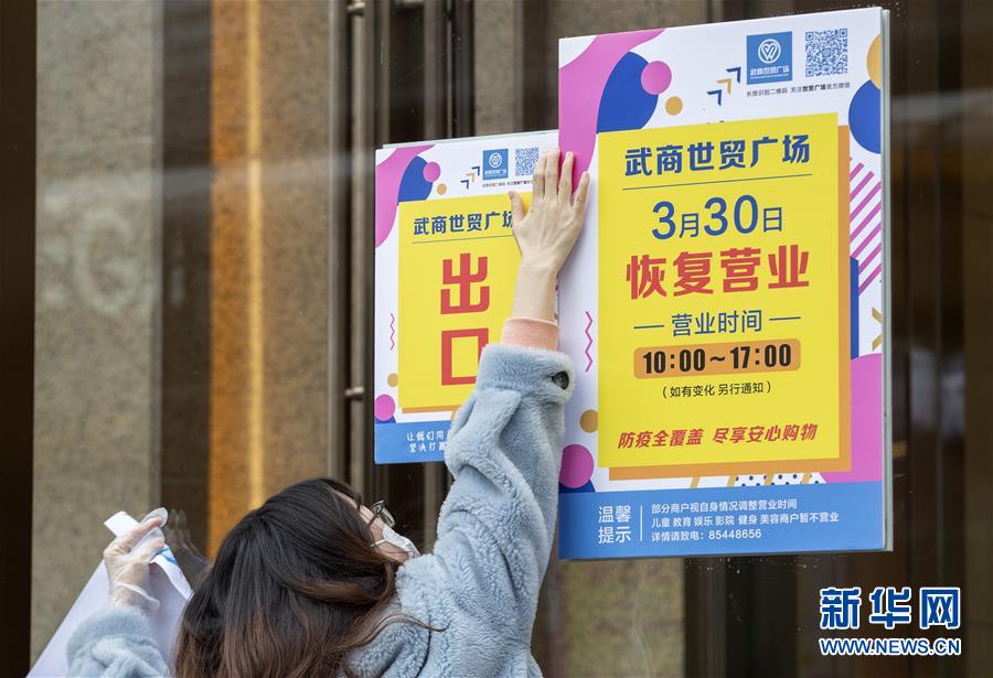 3月30日,在武商世貿(mào)廣場,工作人員在開門前布置標志牌。當日,武漢市多家商場開門迎客。新華社記者費茂華攝
