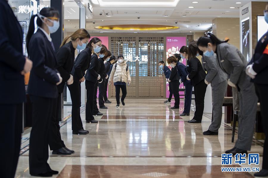 3月30日,在武商世貿(mào)廣場(chǎng),工作人員歡迎顧客進(jìn)入。當(dāng)日,武漢市多家商場(chǎng)開(kāi)門迎客。新華社記者費(fèi)茂華攝