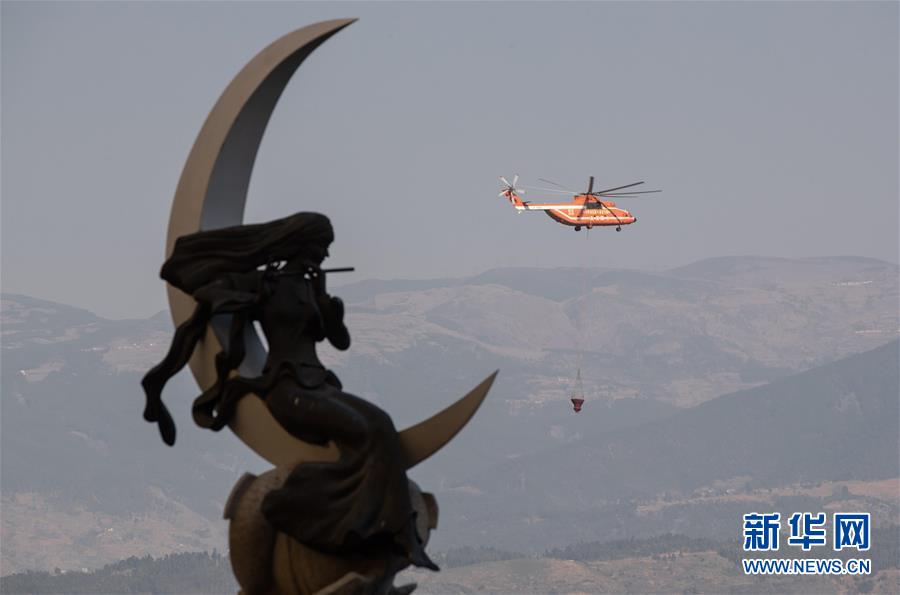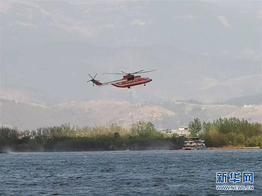 3月31日,在四川省西昌市,救火直升機(jī)從邛海取水。新華社記者惠小勇攝