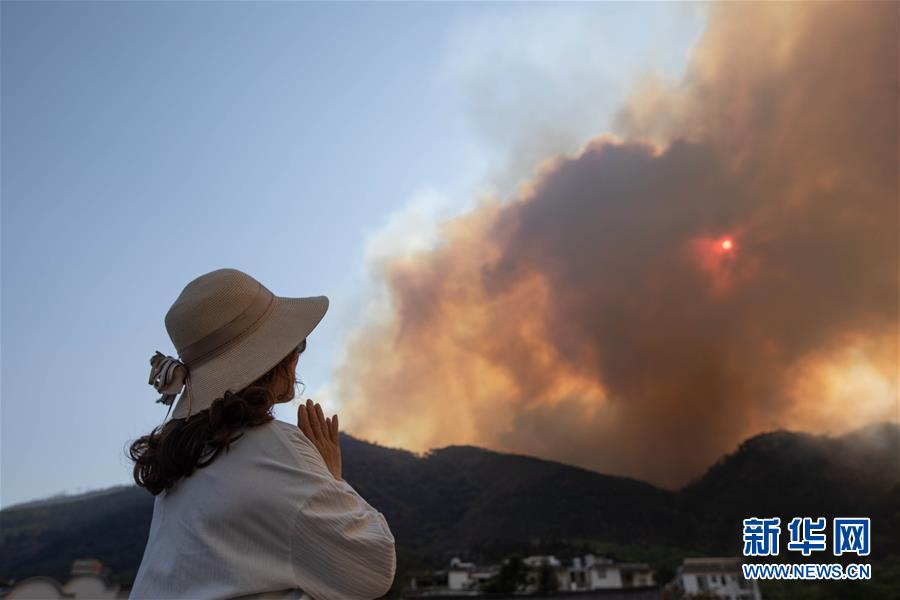 3月31日,一名女士遠(yuǎn)望著火災(zāi)現(xiàn)場祈禱。新華社記者江宏景攝