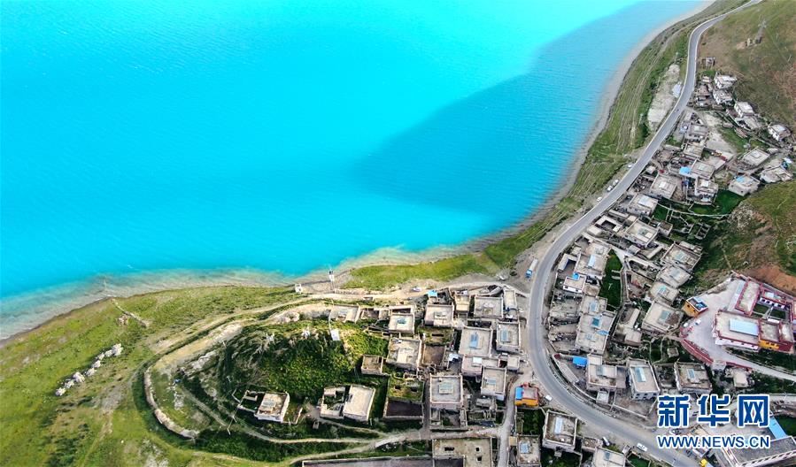 8月31日無人機拍攝的羊卓雍錯及周邊村落。新華社記者晉美多吉攝