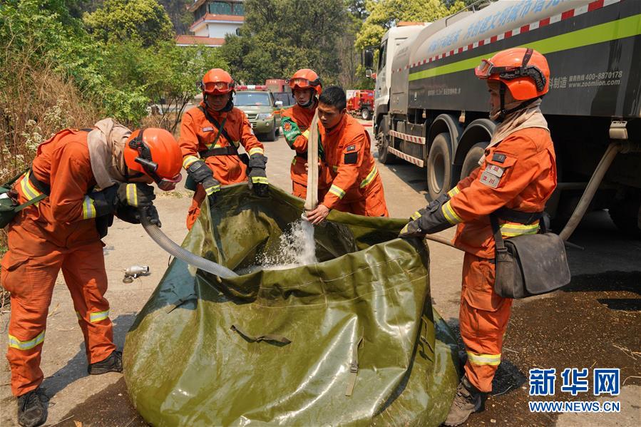 4月1日,在西昌市邛海瀘山景區(qū)臥云山莊旁,消防隊(duì)員在儲(chǔ)水。新華社記者胥冰潔攝
