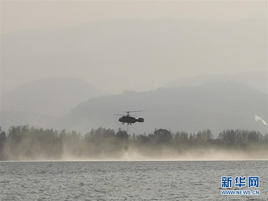4月1日,一架參與西昌森林火災(zāi)滅火的直升機(jī)在邛海中取水(手機(jī)拍攝)。新華社記者惠小勇攝