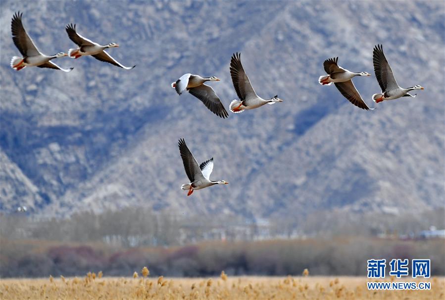3月14日,斑頭雁在拉魯濕地上空飛翔。新華社記者張汝鋒攝