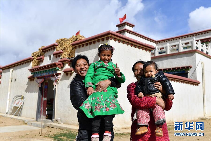 在拉薩市堆龍德慶區(qū)古榮鄉(xiāng)榮瑪高海拔生態(tài)搬遷點,尼加(左一)和家人在家門前合影(4月2日攝)。