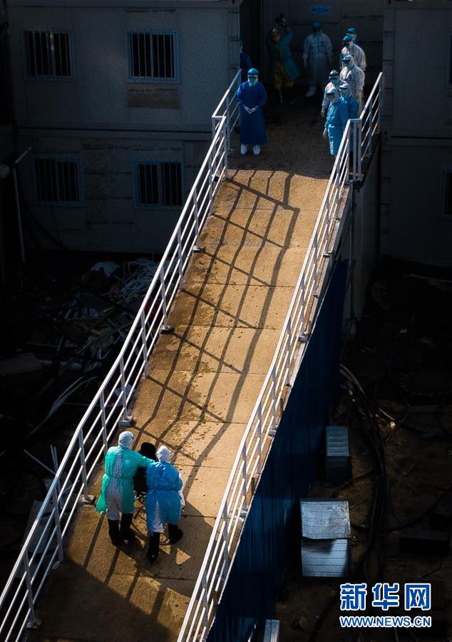2月4日,醫(yī)護(hù)人員將患者送入武漢火神山醫(yī)院病房(無(wú)人機(jī)照片)。 新華社記者肖藝九攝