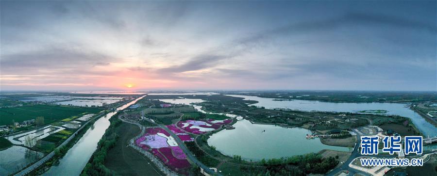 這是4月6日拍攝的白馬湖風光(無人機全景照片)。近日,江蘇省淮安市白馬湖畔春花綻放,景色怡人。白馬湖地處淮河流域下游,東貫大運河,西倚洪澤湖,南北分別銜接淮河入江水道和入海水道,湖泊水域面積113平方公里,是全國15個生態(tài)良好重點保護湖泊之一。  新華社記者 楊磊 攝