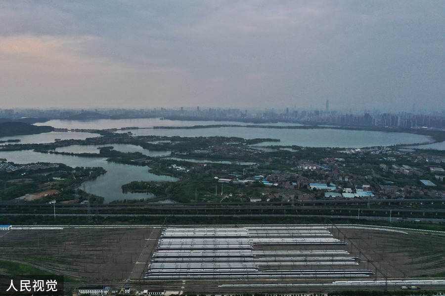 2020年4月6日,武漢動(dòng)車段高鐵動(dòng)車組整裝待發(fā)(無(wú)人機(jī)照片)。