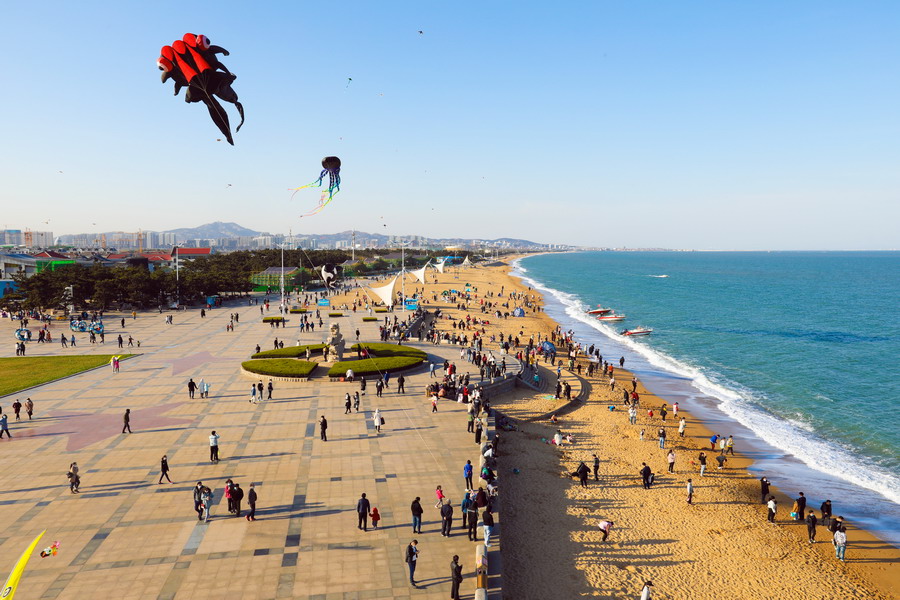 2020年4月5日,在山東日照萬(wàn)平口景區(qū),游客放飛五彩斑斕的風(fēng)箏。