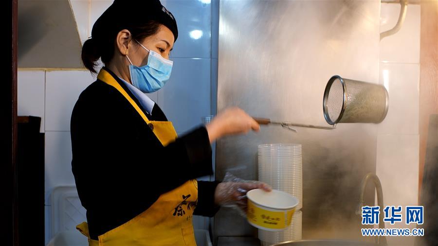 3月28日,“蔡林記”熱干面館店長周秋香在做熱干面。 新華社記者 熊琦 攝