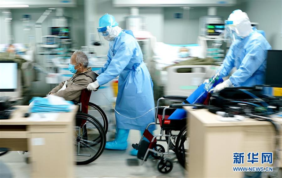 3月20日,武漢火神山醫(yī)院重癥醫(yī)學(xué)一科副主任宋立強(中)護送81歲的新冠肺炎重癥患者去做CT檢查。為確保患者有充足供氧,醫(yī)生胡世頡推著氧氣瓶隨行。 新華社記者 王毓國 攝