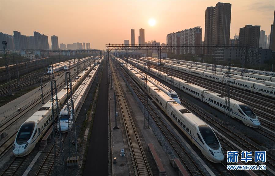 4月8日,在武漢動(dòng)車段,列車停靠在存車線上準(zhǔn)備投入運(yùn)行(無(wú)人機(jī)照片)。 新華社記者 肖藝九 攝