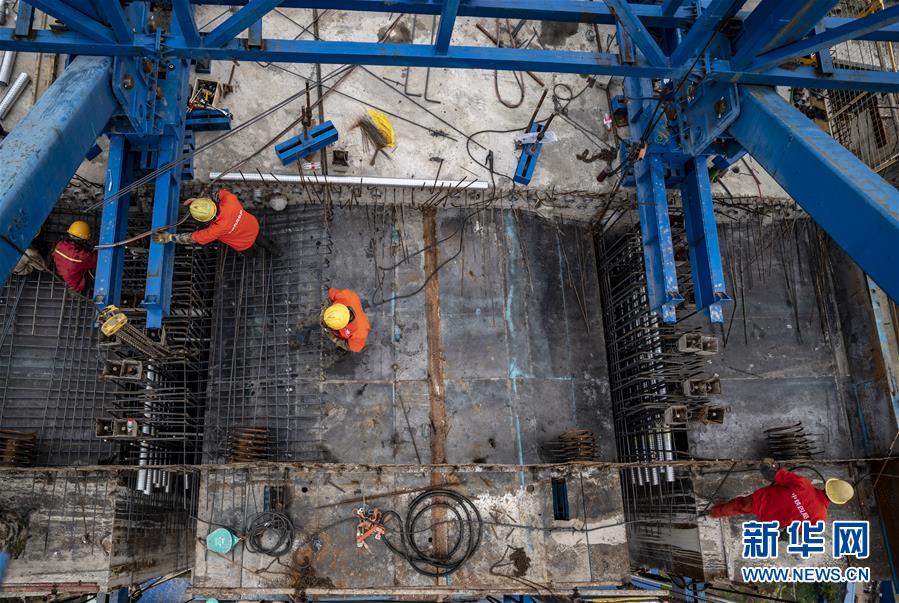 4月8日,中鐵四局的工人們進行鋼桁梁架設(shè)作業(yè)。新華社記者江文耀攝