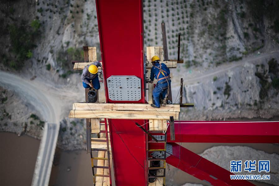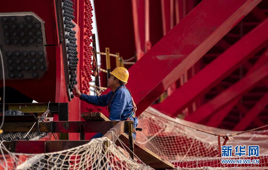 4月8日,兩名中鐵四局職工安裝架設(shè)鋼桁梁,每節(jié)鋼桁梁間的精度需要達(dá)到毫米級才能保證安裝到位。新華社記者江文耀攝