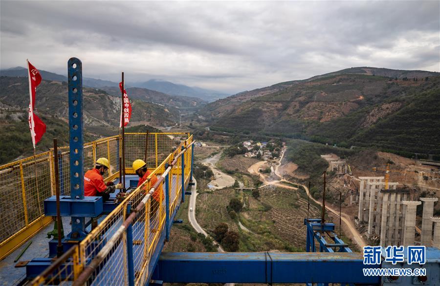 3月5日,工人在中老鐵路南溪河特大橋上施工。新華社記者江文耀攝