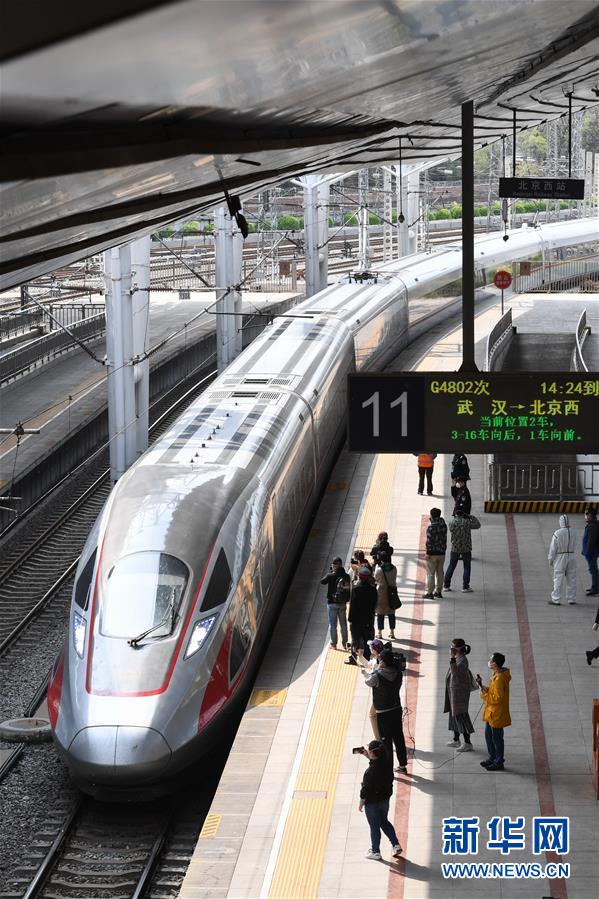 4月8日,G4802次列車駛?cè)氡本┪髡?。?dāng)日,武漢市正式解除離漢離鄂通道管控措施,首趟武漢返京列車G4802次列車抵達北京西站。新華社記者鞠煥宗攝