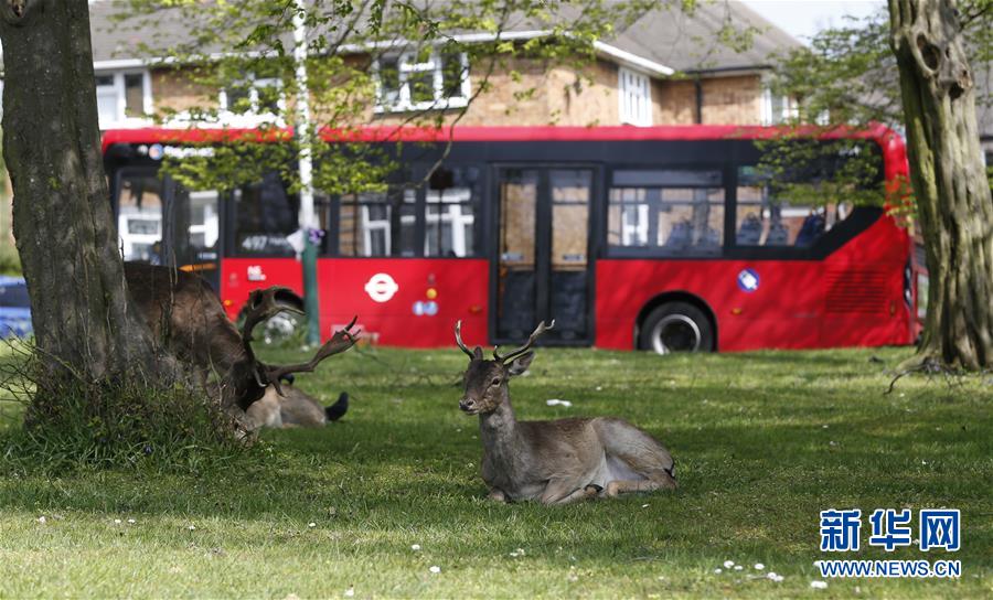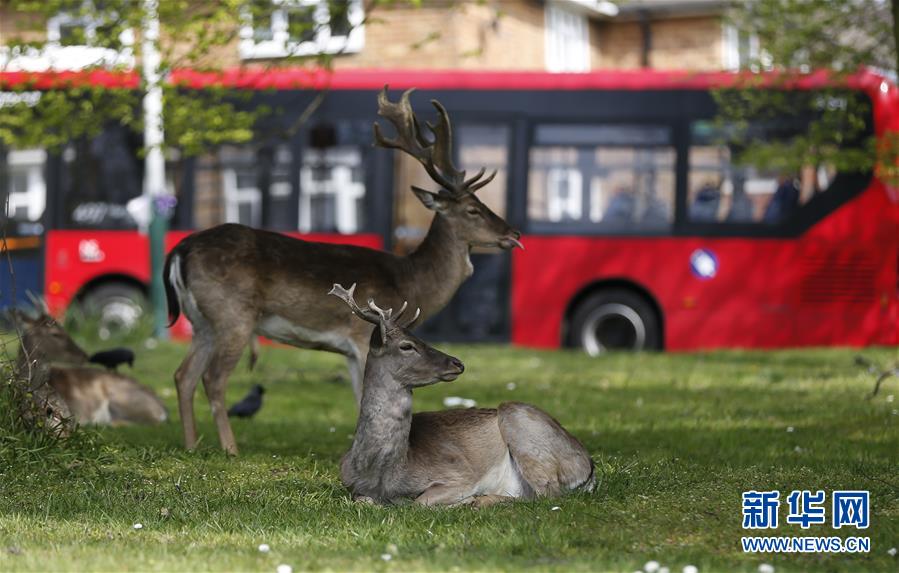 4月8日,在英國倫敦東部一個居民區(qū),附近公園里的鹿在草坪上休息。隨著新冠疫情在英國的擴散,政府要求人們減少不必要的外出。倫敦東部一個居民區(qū)附近公園里原來散養(yǎng)的鹿紛紛從公園走出來,或吃草或接受附近居民的喂食,成為特殊時期居民區(qū)里的新“客人”。新華社記者韓巖攝