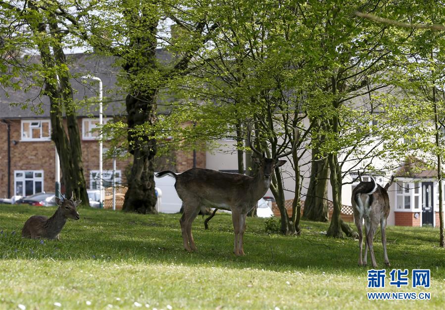 4月8日,在英國倫敦東部一個居民區(qū),附近公園里的鹿在草坪上駐足。隨著新冠疫情在英國的擴散,政府要求人們減少不必要的外出。倫敦東部一個居民區(qū)附近公園里原來散養(yǎng)的鹿紛紛從公園走出來,或吃草或接受附近居民的喂食,成為特殊時期居民區(qū)里的新“客人”。新華社記者韓巖攝