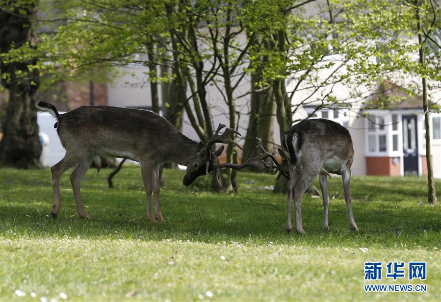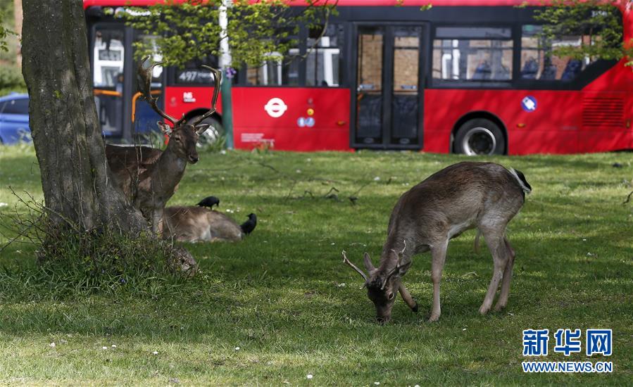 4月8日,在英國倫敦東部一個居民區(qū),附近公園里的鹿在草坪上吃草。隨著新冠疫情在英國的擴散,政府要求人們減少不必要的外出。倫敦東部一個居民區(qū)附近公園里原來散養(yǎng)的鹿紛紛從公園走出來,或吃草或接受附近居民的喂食,成為特殊時期居民區(qū)里的新“客人”。新華社記者韓巖攝