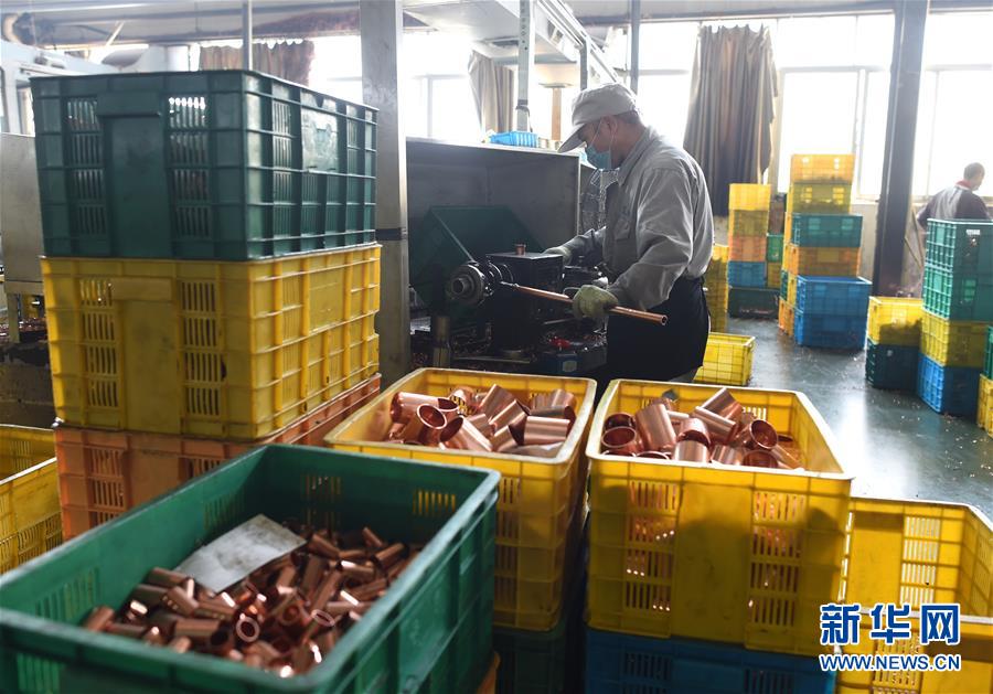 4月13日,員工在位于店口鎮(zhèn)的諸暨市浩??照{(diào)器制造有限公司車間內(nèi)生產(chǎn)銅管件。新華社記者韓傳號(hào)攝