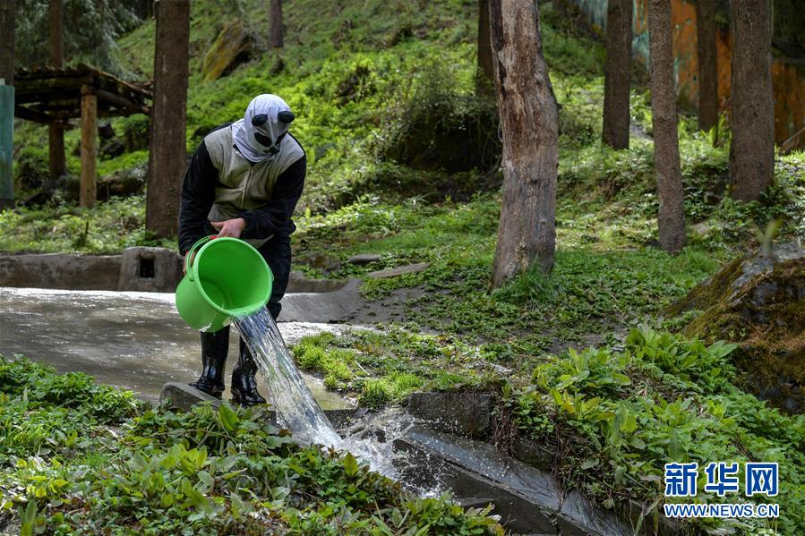 4月14日,中國大熊貓保護(hù)研究中心核桃坪基地的飼養(yǎng)員周季秋身著涂抹了稀釋后大熊貓尿液的“熊貓偽裝服”,在大熊貓活動場內(nèi)打掃衛(wèi)生。新華社記者張超群攝