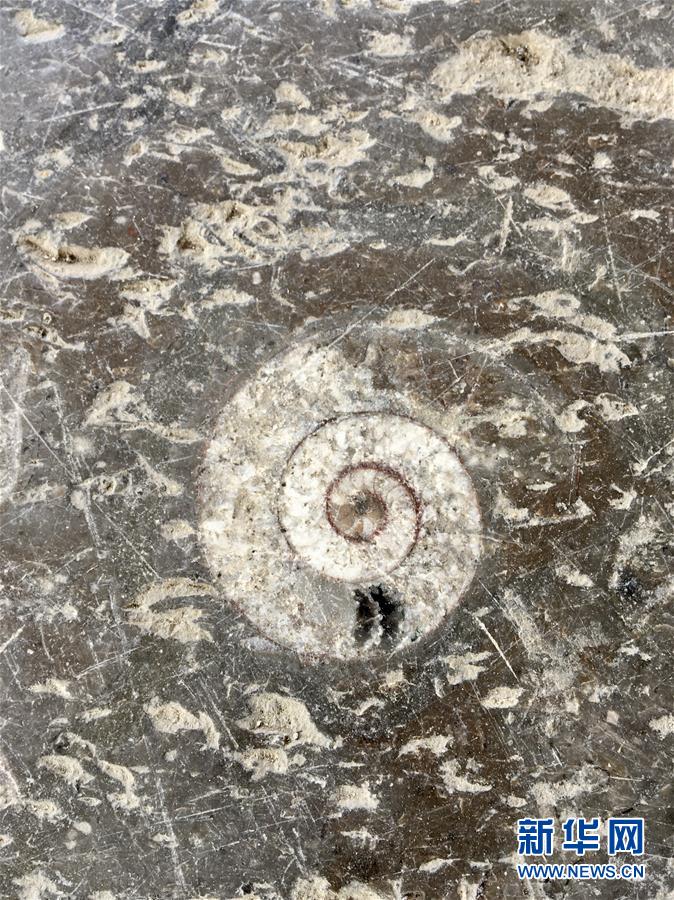 這是4月9日在張家界市區(qū)一路面拍攝的遠(yuǎn)古海洋生物化石地板。新華社記者蘇曉洲攝