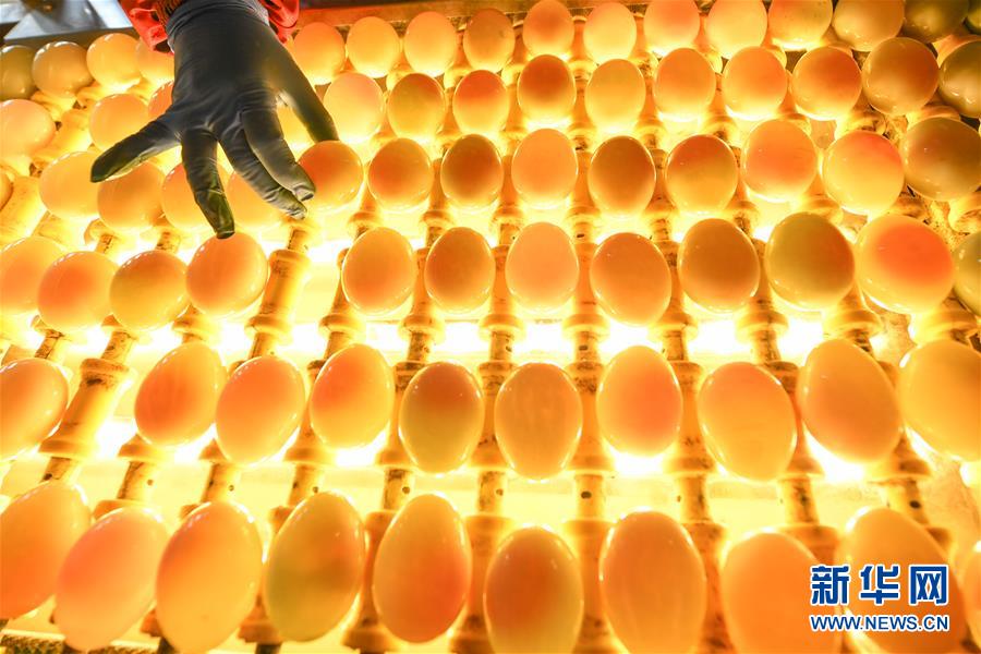江蘇高郵鴨集團(tuán)的工作人員在生產(chǎn)線上對鴨蛋進(jìn)行光檢作業(yè)(4月15日攝)。“高郵鴨蛋”是江蘇高郵的特色農(nóng)業(yè)名片。近年來,當(dāng)?shù)卦诹挤N繁育、生態(tài)養(yǎng)殖、產(chǎn)品加工等方面加大力度,推動高郵鴨蛋品牌化建設(shè),讓小鴨蛋成為帶動農(nóng)戶致富的大產(chǎn)業(yè)。2019年,高郵市共計(jì)生產(chǎn)熟制鴨蛋產(chǎn)品近11.2億枚,年產(chǎn)值近17.68億元。新華社記者李博攝