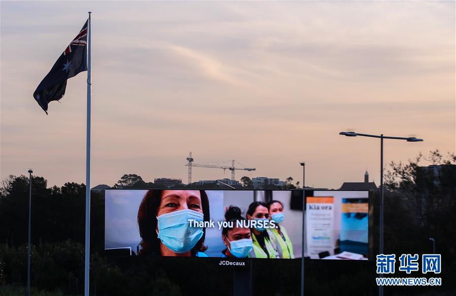 4月15日,在澳大利亞悉尼,戶外廣告牌上打出“感謝護(hù)士”的字樣,感謝在疫情期間工作的人們。新華社記者白雪飛攝