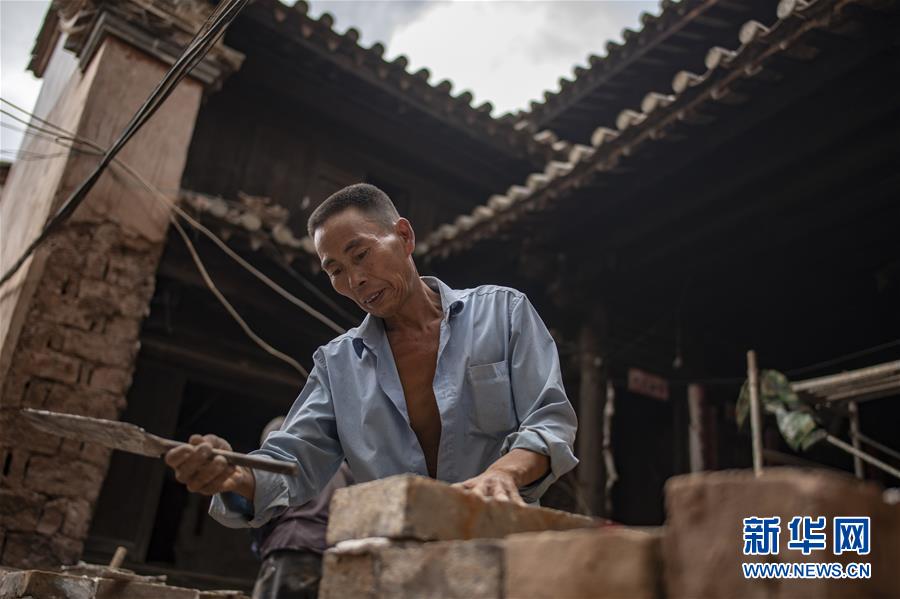 工人王建雄在修繕石屏縣異龍鎮(zhèn)符家營村189號(hào)民居的圍墻(8月8日攝)。新華社記者江文耀攝