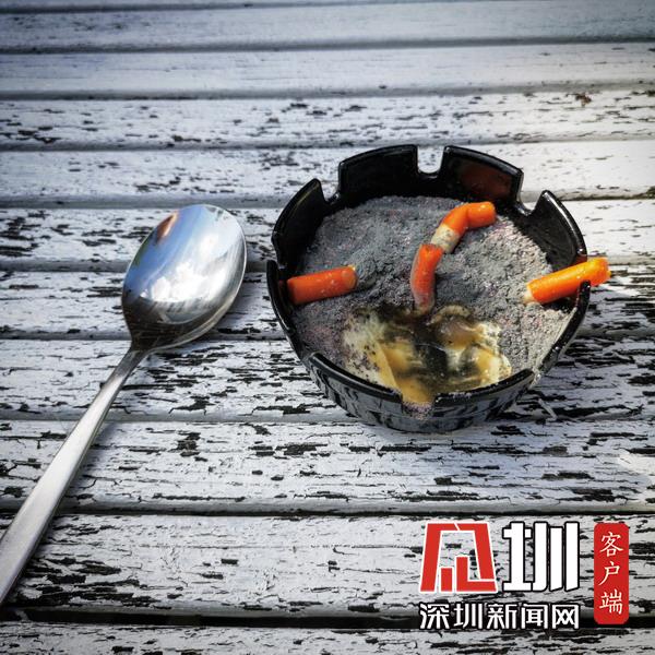 “煙灰缸”奶酪。煙灰缸內(nèi)放置著瓦尼拉蔓越莓慕斯,巧克力還有蛋白粉末制作的煙頭煙灰。