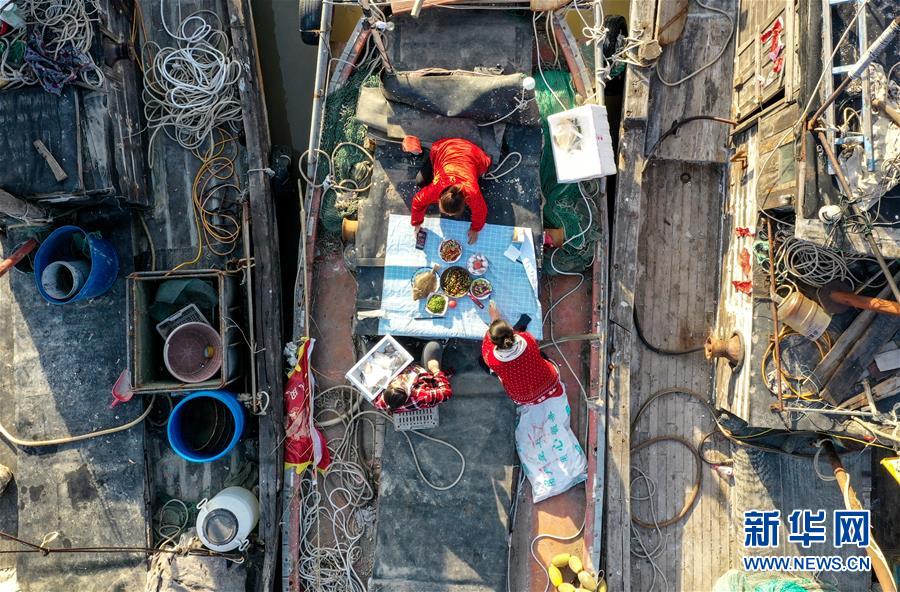 4月22日,馬花雨(下右)、徐紅紅(上)、陸倩(下左)在漁船上拍攝推銷海產(chǎn)品的短視頻。近年來,江蘇省連云港市贛榆區(qū)海頭鎮(zhèn)越來越多的居民開始直播銷售海產(chǎn)品,當(dāng)?shù)貪O船、碼頭和市場上活躍著一批網(wǎng)絡(luò)直播好手。目前,全鎮(zhèn)有3000多戶商家從事海產(chǎn)品直播銷售業(yè)務(wù),形成了集捕撈、加工、包裝、銷售和物流于一體的電商產(chǎn)業(yè)鏈。新華社記者楊磊攝