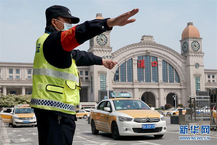 4月8日,管理人員在漢口火車(chē)站前指揮出租汽車(chē)入位。新華社記者王毓國(guó)攝