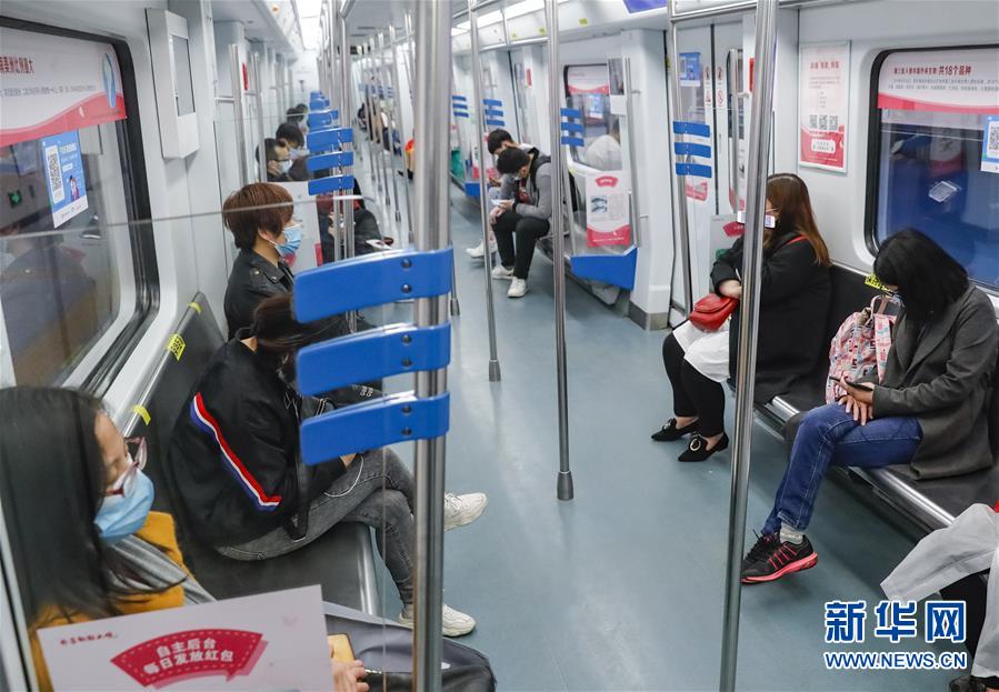 4月22日,在武漢軌道交通一號(hào)線上,乘客間隔一定距離坐在車廂里。為建立與經(jīng)濟(jì)社會(huì)發(fā)展和疫情防控需要相適應(yīng)的運(yùn)輸服務(wù)保障機(jī)制,保障市民出行需求,從4月22日起,武漢城市公共交通有序恢復(fù)全線網(wǎng)運(yùn)營。新華社記者沈伯韓攝