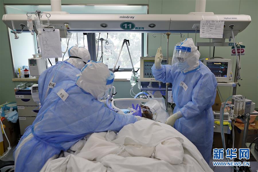 4月24日,在位于武漢的華中科技大學同濟醫(yī)學院附屬協(xié)和醫(yī)院西院,醫(yī)務人員馬夢琳、李菠、何玨(從左至右)在護理核酸檢測結果轉陰的新冠肺炎病人。新華社記者沈伯韓攝