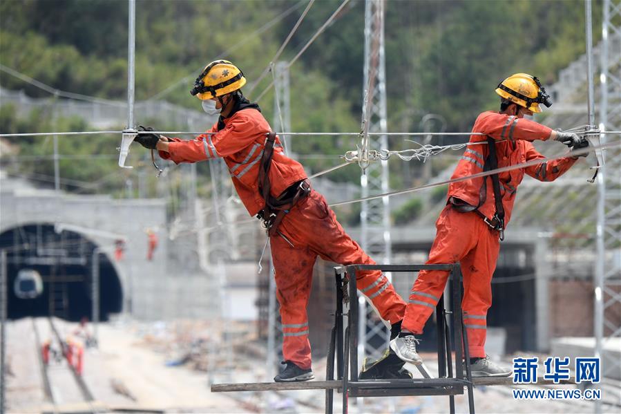 4月25日,在福建省寧德市屏南車站,施工人員開展接觸網(wǎng)調(diào)整作業(yè)。中鐵電氣化局集團(tuán)上海公司推動衢寧鐵路福建段通信工程、信號工程、電力工程、電氣化工程各環(huán)節(jié)協(xié)同復(fù)工復(fù)產(chǎn),目前來自河北、河南、四川等國內(nèi)10個省的900多名員工返崗就業(yè)。衢寧鐵路北起浙江省衢州市,南至福建省寧德市,全長379.2公里。新華社記者彭張青攝
