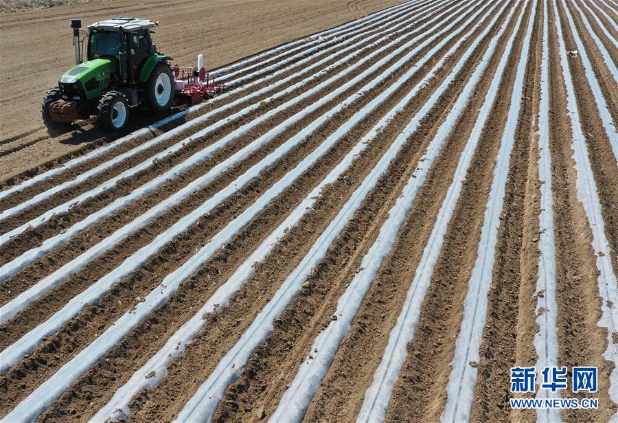 4月25日,灤南縣東黃坨鎮(zhèn)新戶村農(nóng)民使用拖拉機(jī)給準(zhǔn)備栽植煙薯秧苗的土地開(kāi)溝覆膜(無(wú)人機(jī)照片)。近年來(lái),河北省灤南縣利用當(dāng)?shù)赝寥篮蜌夂蛱攸c(diǎn),引導(dǎo)農(nóng)民因地制宜發(fā)展煙薯種植,取得良好效果。目前該縣煙薯種植面積達(dá)3萬(wàn)多畝,每畝年收入達(dá)5000多元。新華社記者楊世堯攝