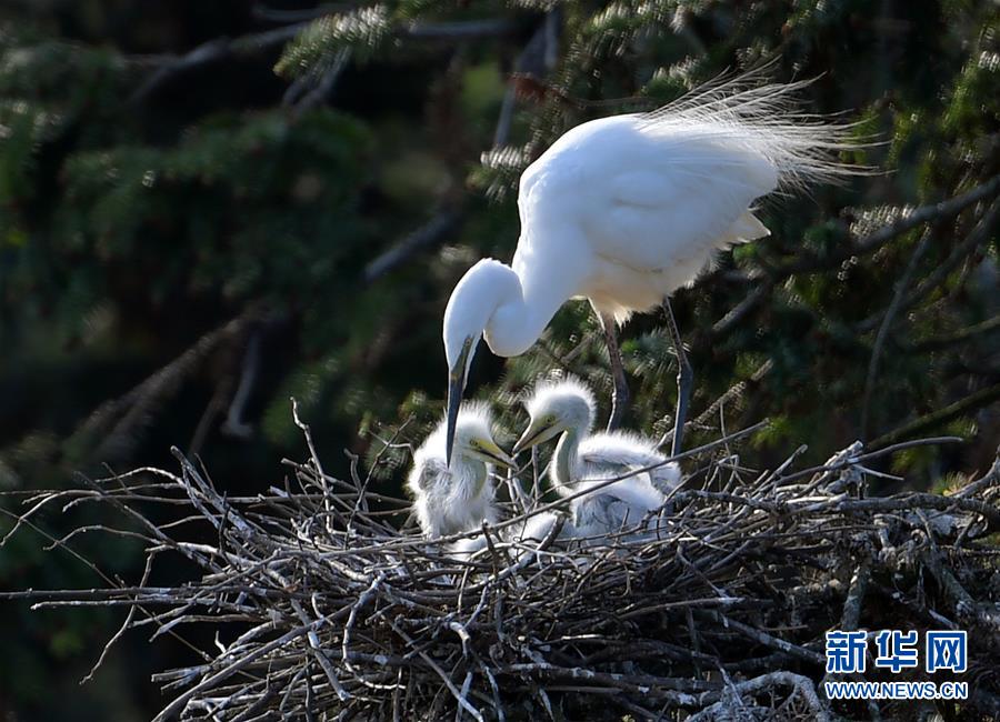 在象山森林公園,白鷺和幼鳥在一起(4月26日攝)。近日,在江西省南昌市新建區(qū)象山森林公園內(nèi),已安家筑巢的大批鷺鳥正陸續(xù)孵化后代,一派生機(jī)勃勃的景象。新華社記者彭昭之?dāng)z