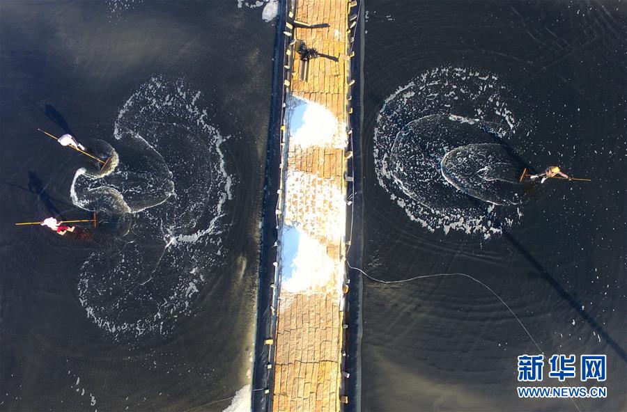 4月27日,莆田鹽場的工人在勞作。莆田鹽場位于福建省莆田市秀嶼區(qū)東嶠鎮(zhèn),辛勤勞作的鹽工、縱橫交錯的曬鹽池,共同構(gòu)成如畫的風(fēng)景。新華社記者魏培全攝