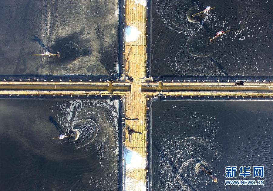 4月27日,莆田鹽場的工人在曬鹽池里忙碌(無人機照片)。莆田鹽場位于福建省莆田市秀嶼區(qū)東嶠鎮(zhèn),辛勤勞作的鹽工、縱橫交錯的曬鹽池,共同構(gòu)成如畫的風(fēng)景。新華社記者魏培全攝