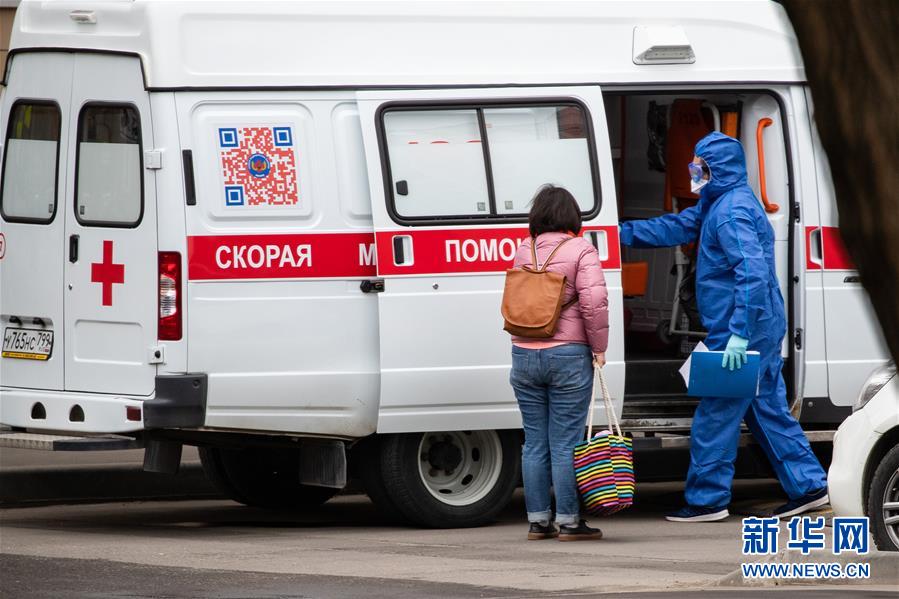 4月27日,在俄羅斯首都莫斯科,醫(yī)護人員(右)引導一名女子走上救護車。據(jù)俄羅斯防疫指揮部27日消息,過去24小時俄新增新冠肺炎確診病例6198例,累計確診87147例,單日增幅7.66%。新華社記者白雪騏攝