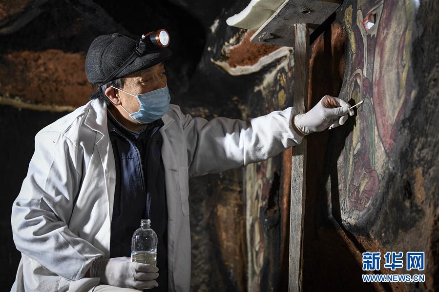 4月27日,文物修復(fù)專家在寧夏須彌山石窟圓光寺48號(hào)窟內(nèi)修復(fù)壁畫。新華社記者馮開華攝